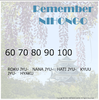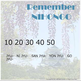 ” 10 ” is Jyu-. we studied this word already. then ” 20 ” is NI JYU- , SAN JYU- , YON JYU- , GO JYU-.