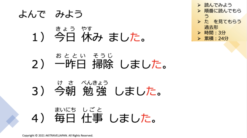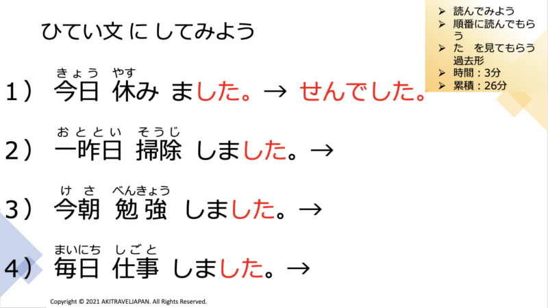 Next our assessment, we change to negative sentence. 1. KYOU YASUMI MASITA. Meaning, I took day off today. In Japanese language, ” せんでした “. This is negative word.
