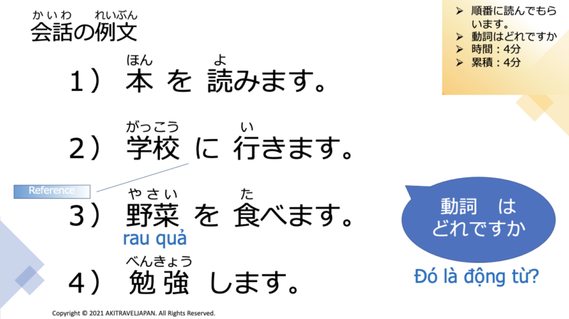 1) HON WO YOMIMASU. HON: Book YOMIMASU: read