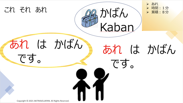 ”あれはなんですか?”(What is that?) ”あれ は かばん です”