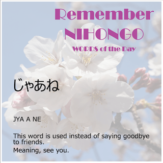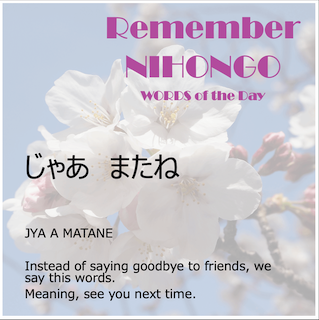 ” JYA A NE ” and ” JYA A MATANE “, means “see you” and “see you next time” ! . About those, you say these to your friends. You shouldn’t use these to your boss, your teacher and some superiors. Additionally, surely you know ” SAYONARA ”. This is easy to remember, but must not be used for either close friends or anybody.