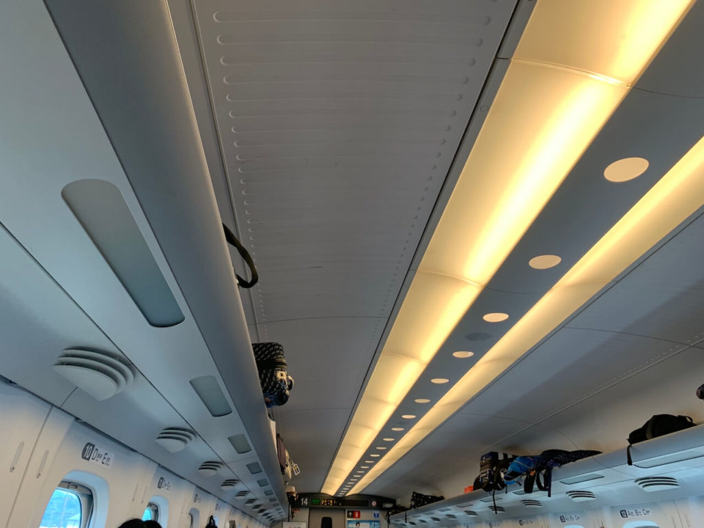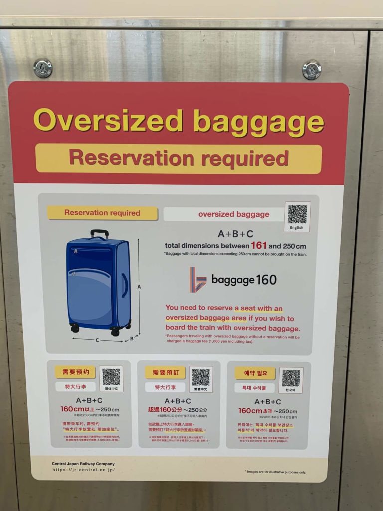 Inside the shinkansen, there is an available cabin luggage stock above your seats. Like mine, my luggage size is 64L, but I can use the one.
