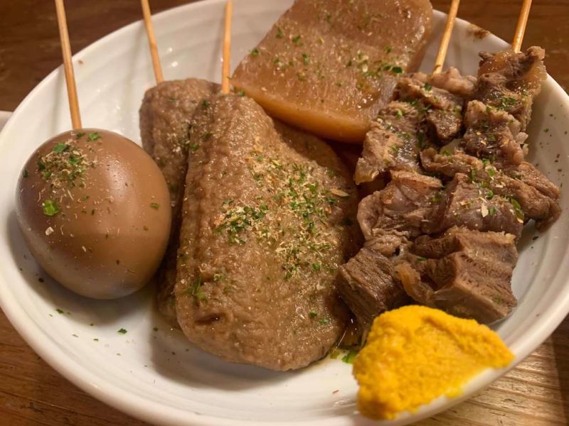 I also want to introduce the Shizuoka traditional food. It is Shizuoka ODEN.Shizuoka oden is a hot-pot dish with denser soup using dark soy sauce. Ingredients are Daikon, Fishcake, Boiled egg, Konjac etc, you can choose them. This oden feature is eaten with green nori powder and dashi powder.